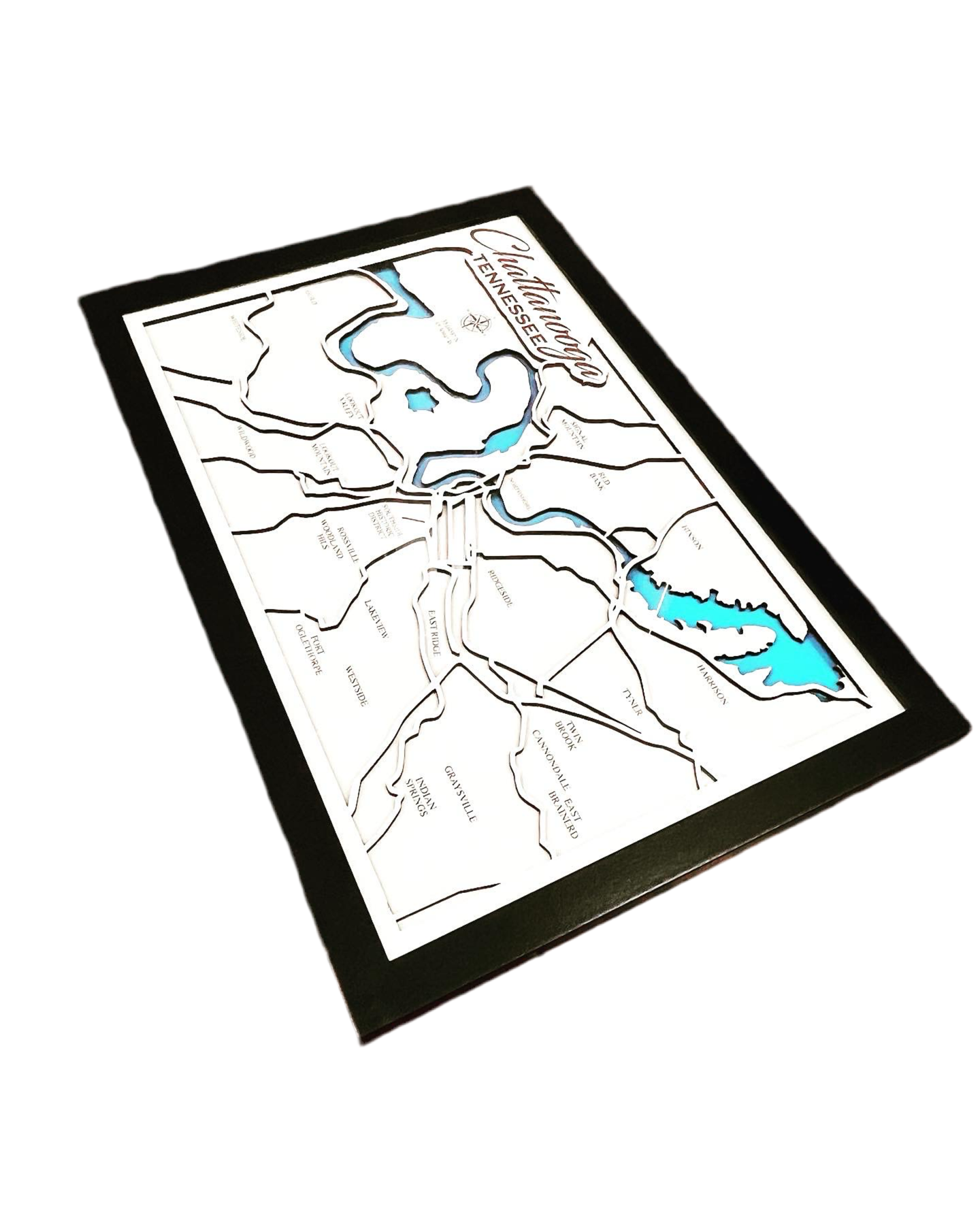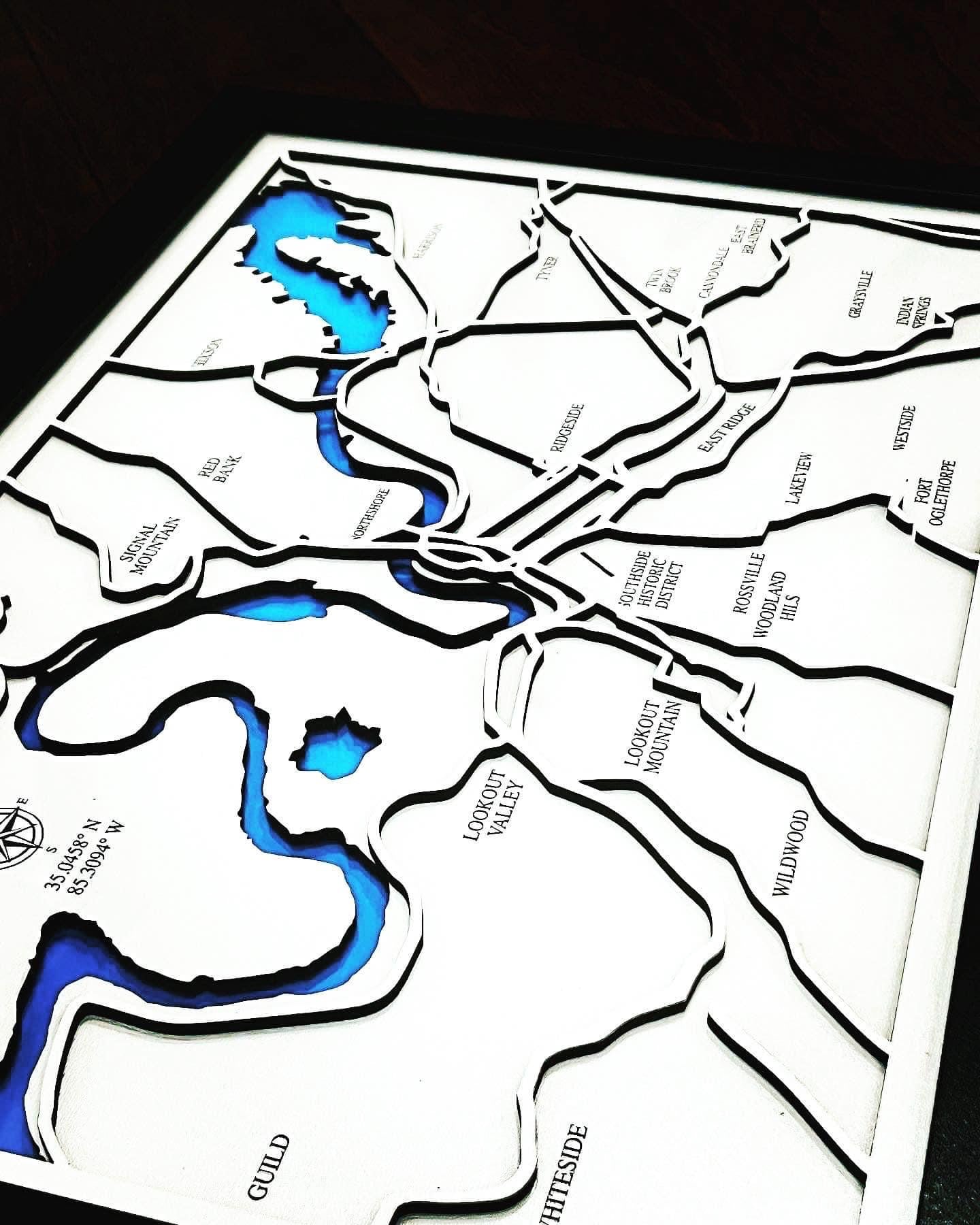 Process: Each map has been computer-generated and designed to provide specifically requested details of the customer. After design is complete, it is then cut out of 1/8 inch whiteboard by high-powered laser to provide intricately-cut geographic structures of the landmarks requested. After the design is cut, it is immediately placed in glass-encased frame. The item is then shipped USPS priority.